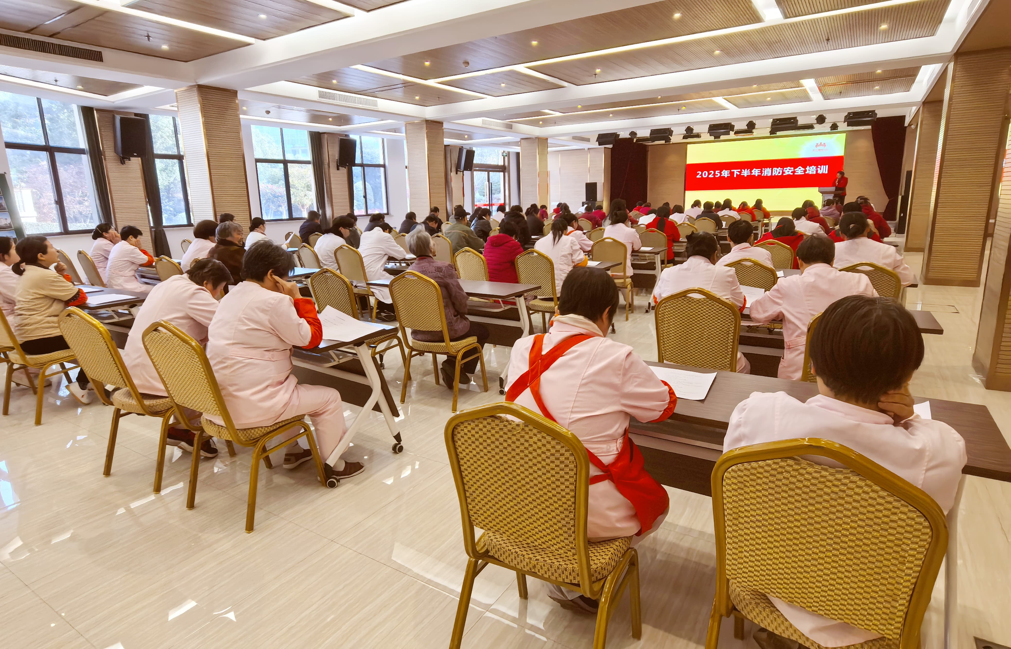 此次理论培训由常务副院长袁瑞主讲,她围绕养老机构常见火灾风险、预防措施、报警流程以及疏散逃生要点等内容进行讲解,重点强调了火场逃生关键要领,通过真实案例剖析,进一步强化了员工“安全无小事、防患于未然”的责任意识,为后续实操演练奠定了扎实的理论基础。之后,全员会进行理论试卷作答,以巩固消防安全知识。