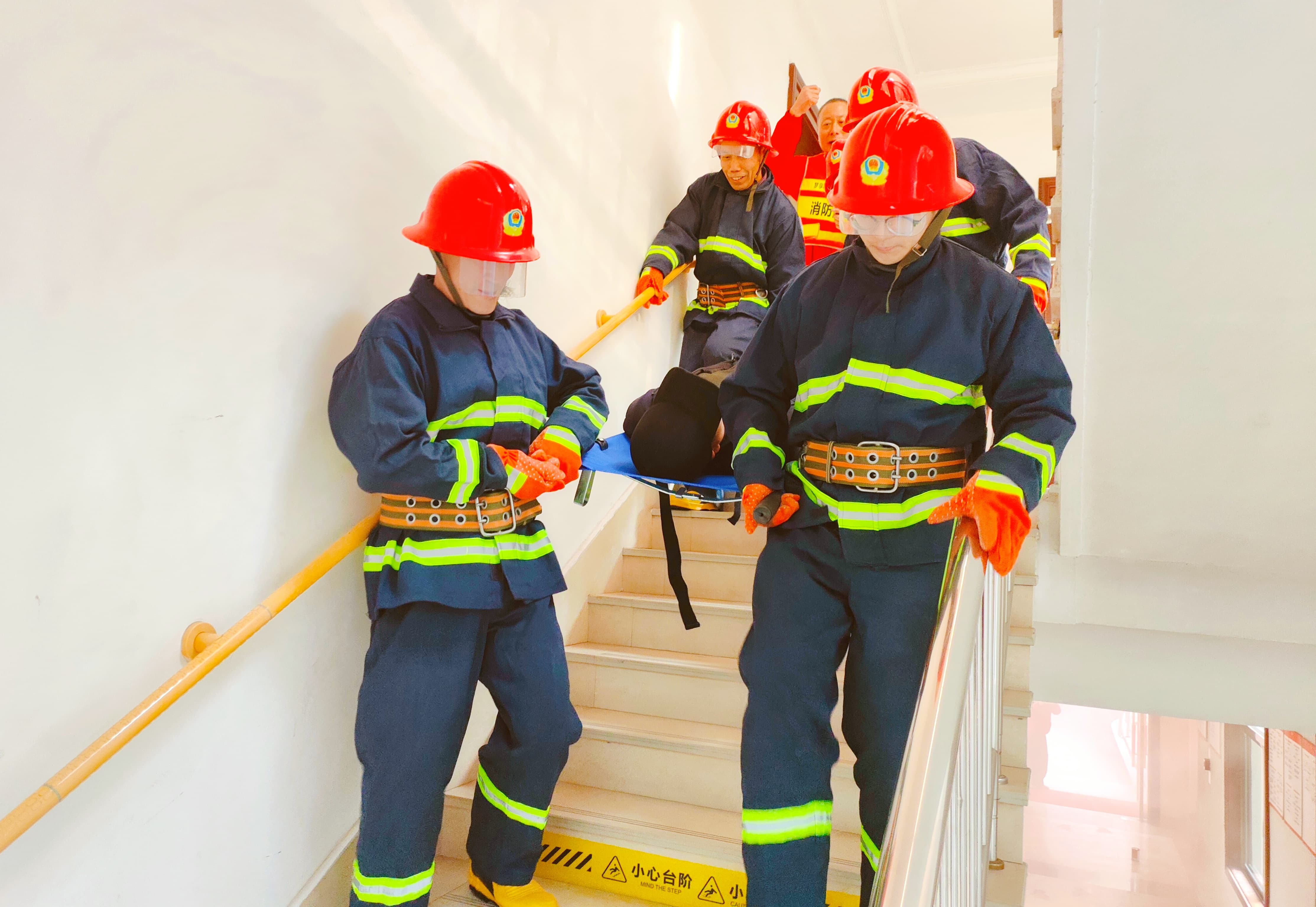 疏散演练结束后,相继开展了电梯困人救援、微型消防站拉练、消防水带训练等专项演练。在电梯困人场景中,从报警、安抚到专业救援,各环节衔接紧密,展现出了高效的应急协调与处置能力。微型消防站成员着好装出动迅速,体现了日常训练下的演练实战素养。