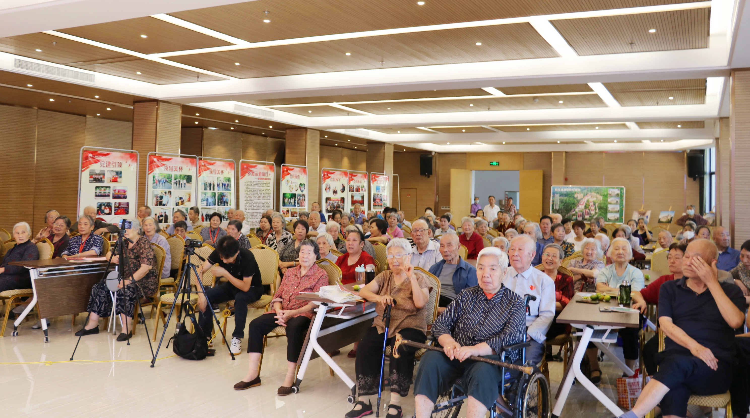 当天,剧组工作人员早早就来到中心,演员们忙着化妆,音响师忙着调音,各司其职,有条不紊。长者们则满心欢喜,雀跃地来到大礼堂,期待着精彩的演出,现场顿时座无虚席。
