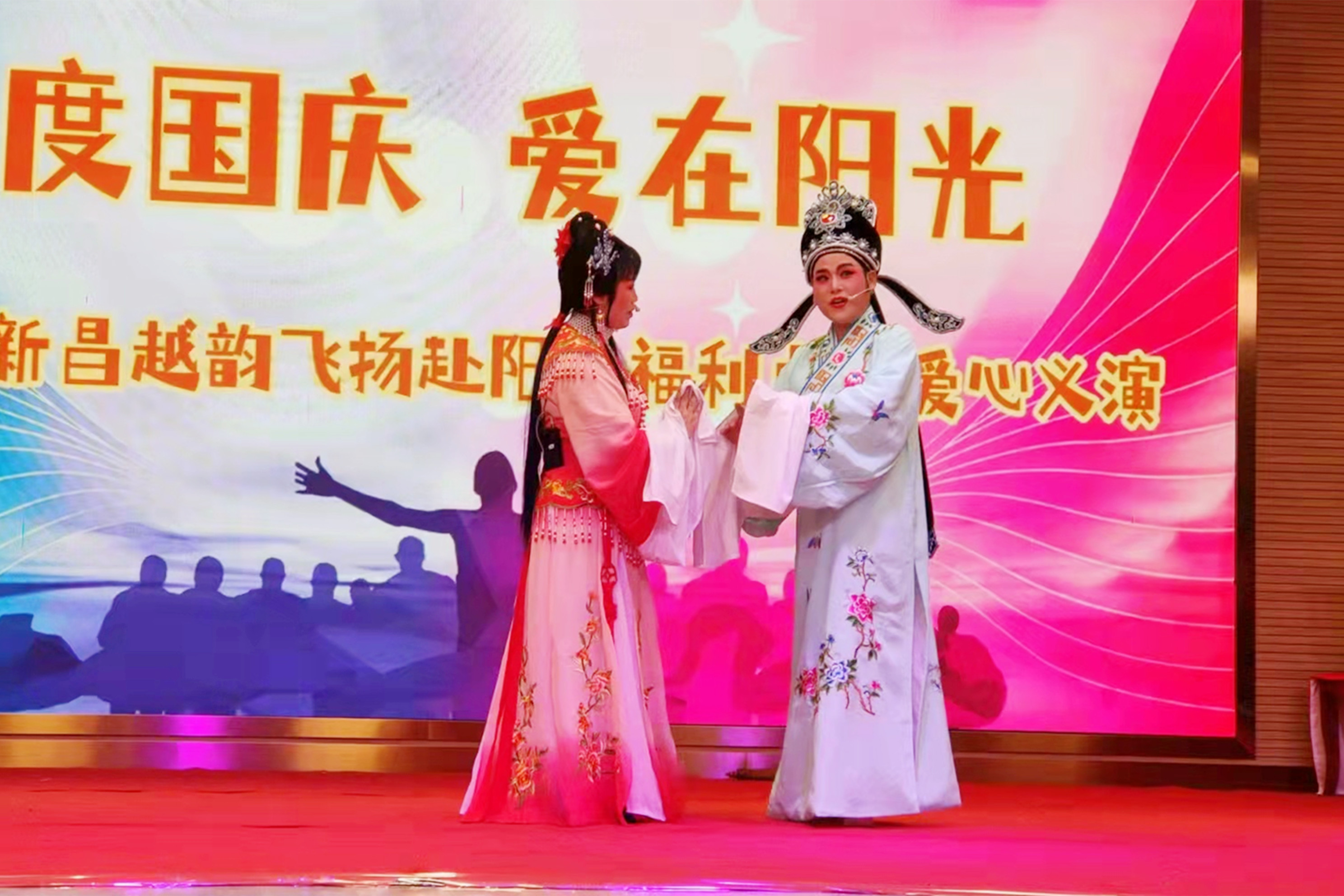 国庆期间,一场以“欢度国庆、爱在阳光”为主题的爱心义演在中心大礼堂隆重举行,此场义演由员工石沈燕组织并主持,邀请了新昌越韵飞扬戏苑陈绍妃、俞国贞及杨小连等演员们来共同倾情演绎。