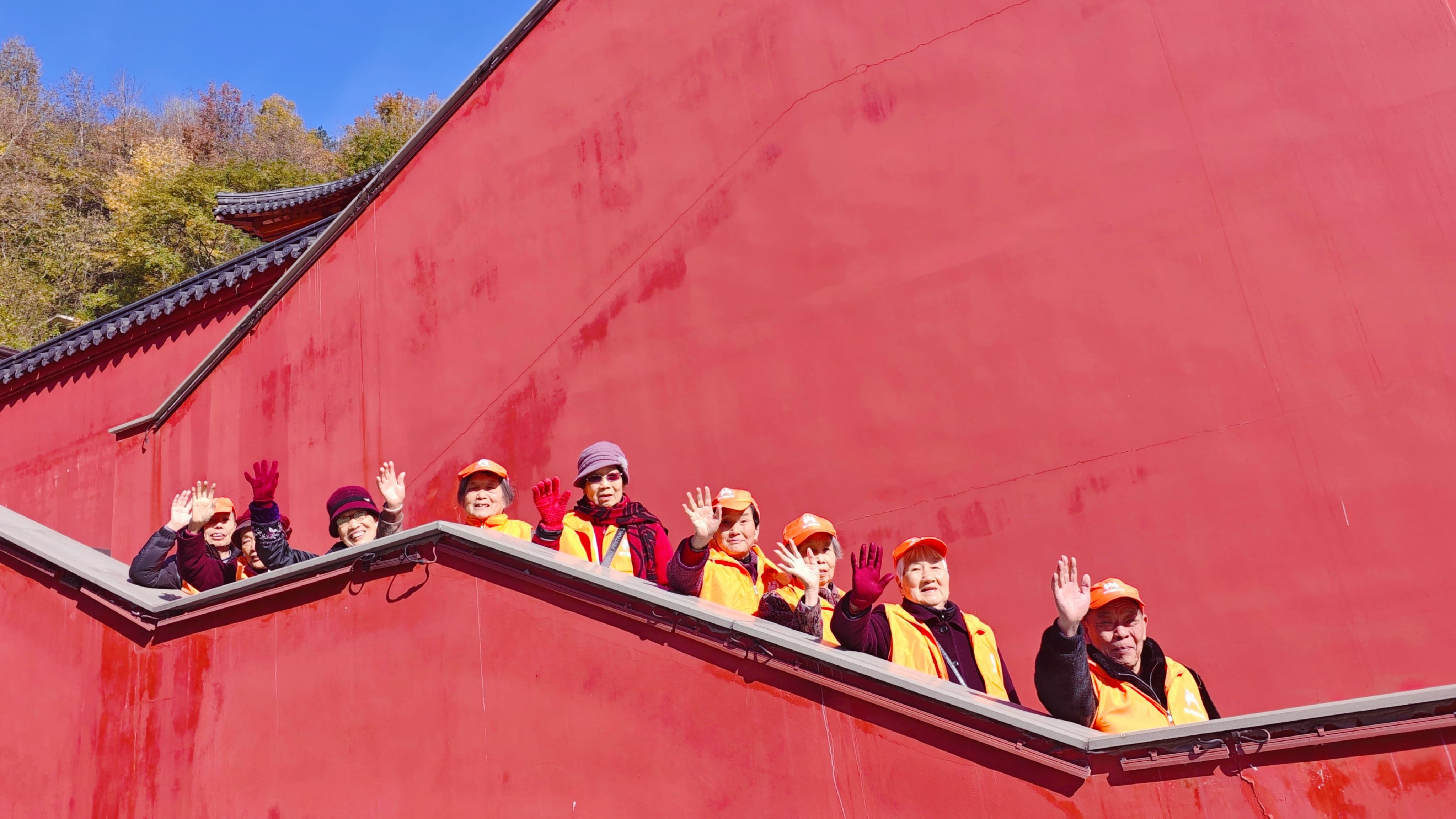 抵达重阳宫后,古朴的牌坊、依山而建的殿宇与层林尽染的秋日风光相映成趣,让长者们眼前一亮。在工作人员的引导下,大家沿着平缓步道前行,探访了慈航殿、全真殿等核心建筑,欣赏精巧的木雕与庄严的神像,感受道家文化的厚重底蕴。得知这里曾是吴筠结庐之地,李白等文人雅士亦曾在此诗酒相酬,众人纷纷驻足聆听,赞叹“家门口的这座名胜竟蕴藏着如此丰富的文化故事”。