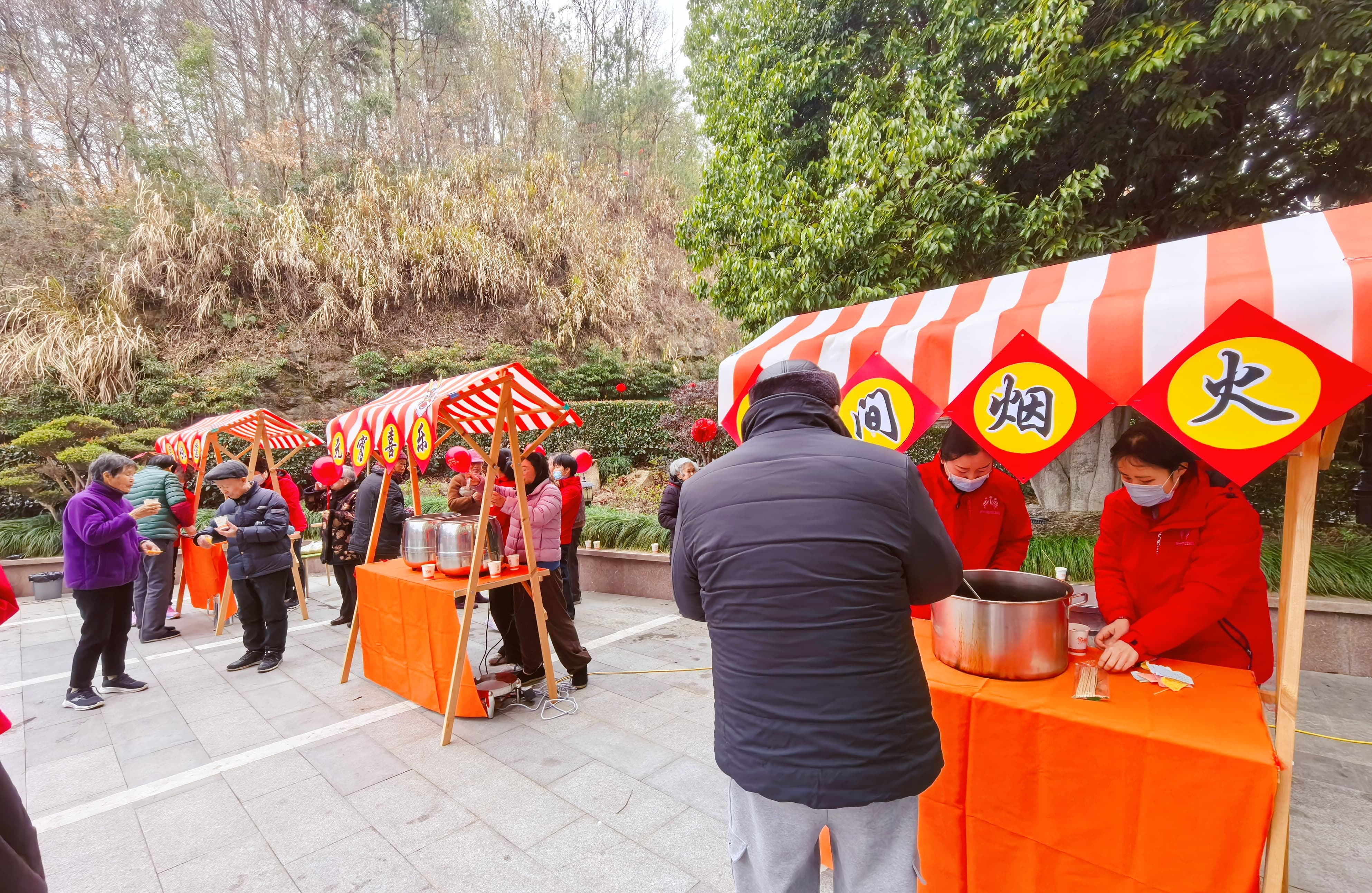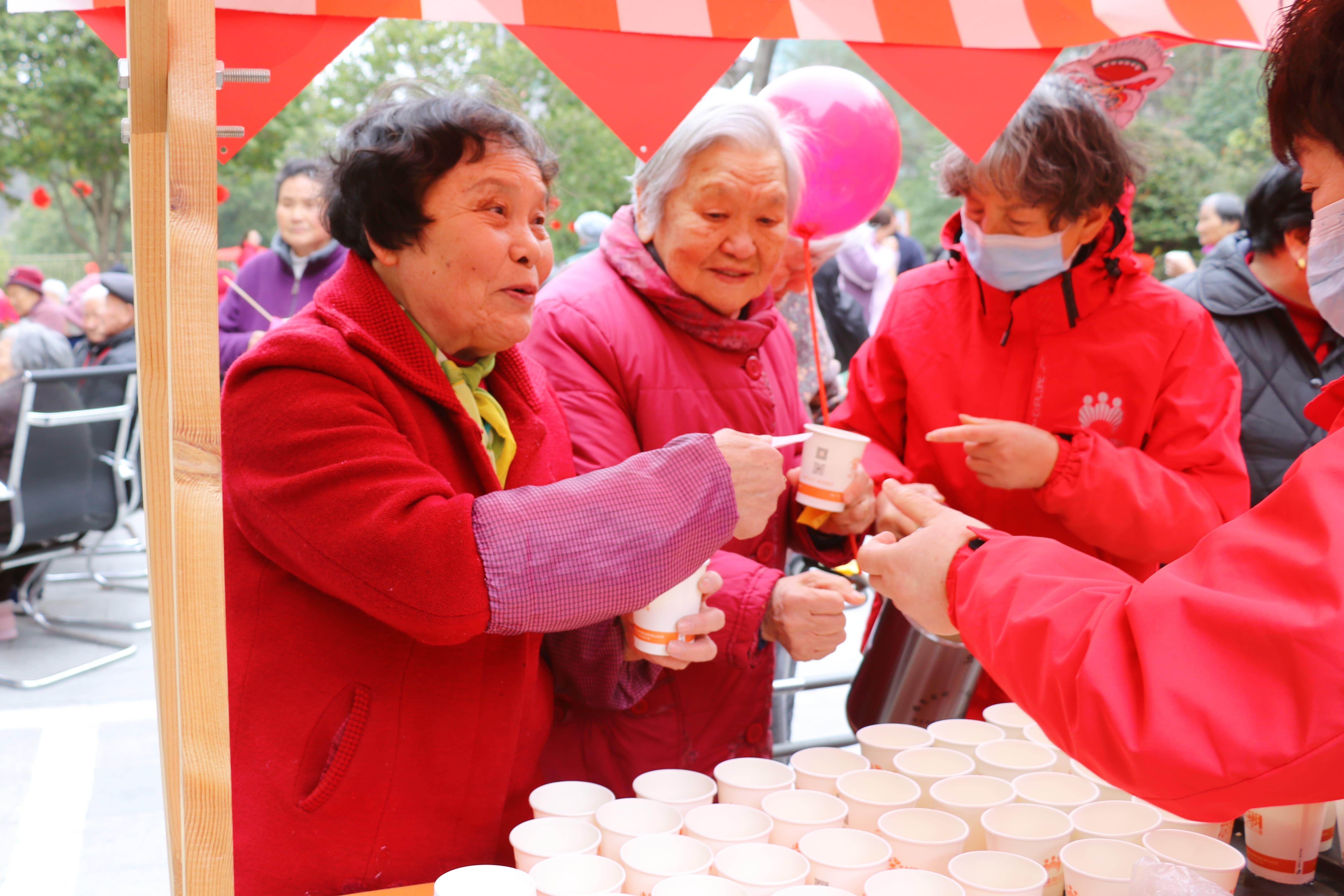 “喜乐元宵·酒酿小丸子”摊位洋溢着甜蜜的节日氛围,软糯的小丸子搭配清甜的酒酿与桂花蜜,香甜可口,寓意团团圆圆、甜甜蜜蜜。工作人员将一碗碗精心制作的酒酿小丸子递到长者手中,每一口都饱含着对长者们的美好祝福。